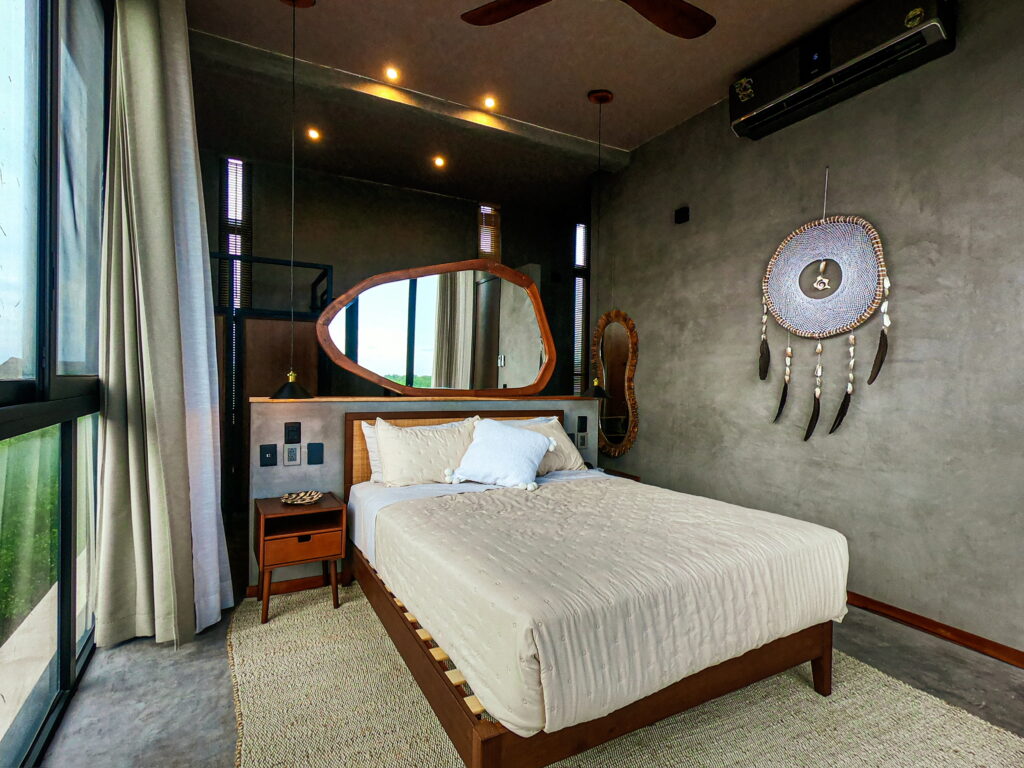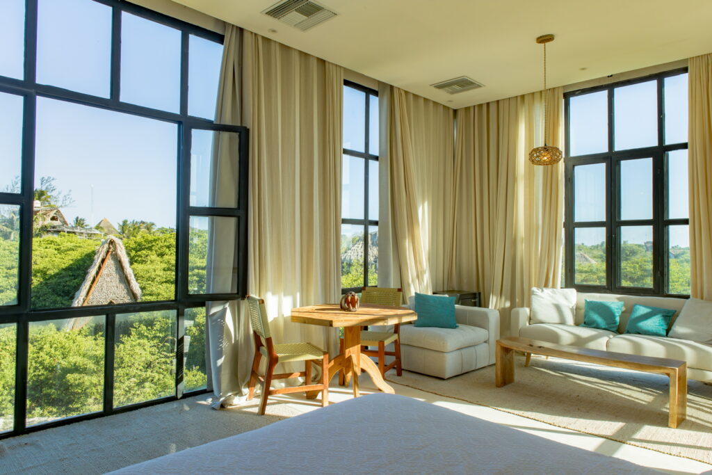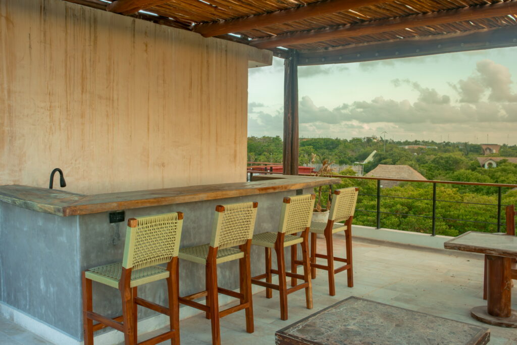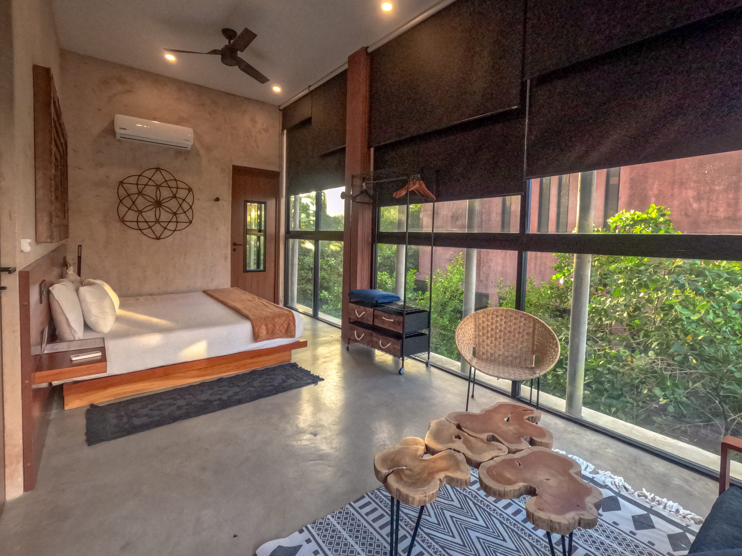 Escape to our Tulum Suite, complete with a private terrace, jungle views, king-size bed, kitchenette, and access to a rooftop with breathtaking sunsets — the perfect retreat for relaxation.