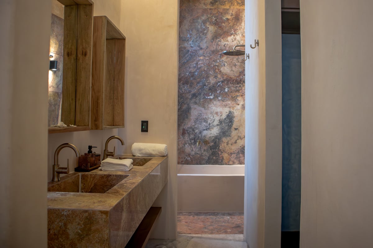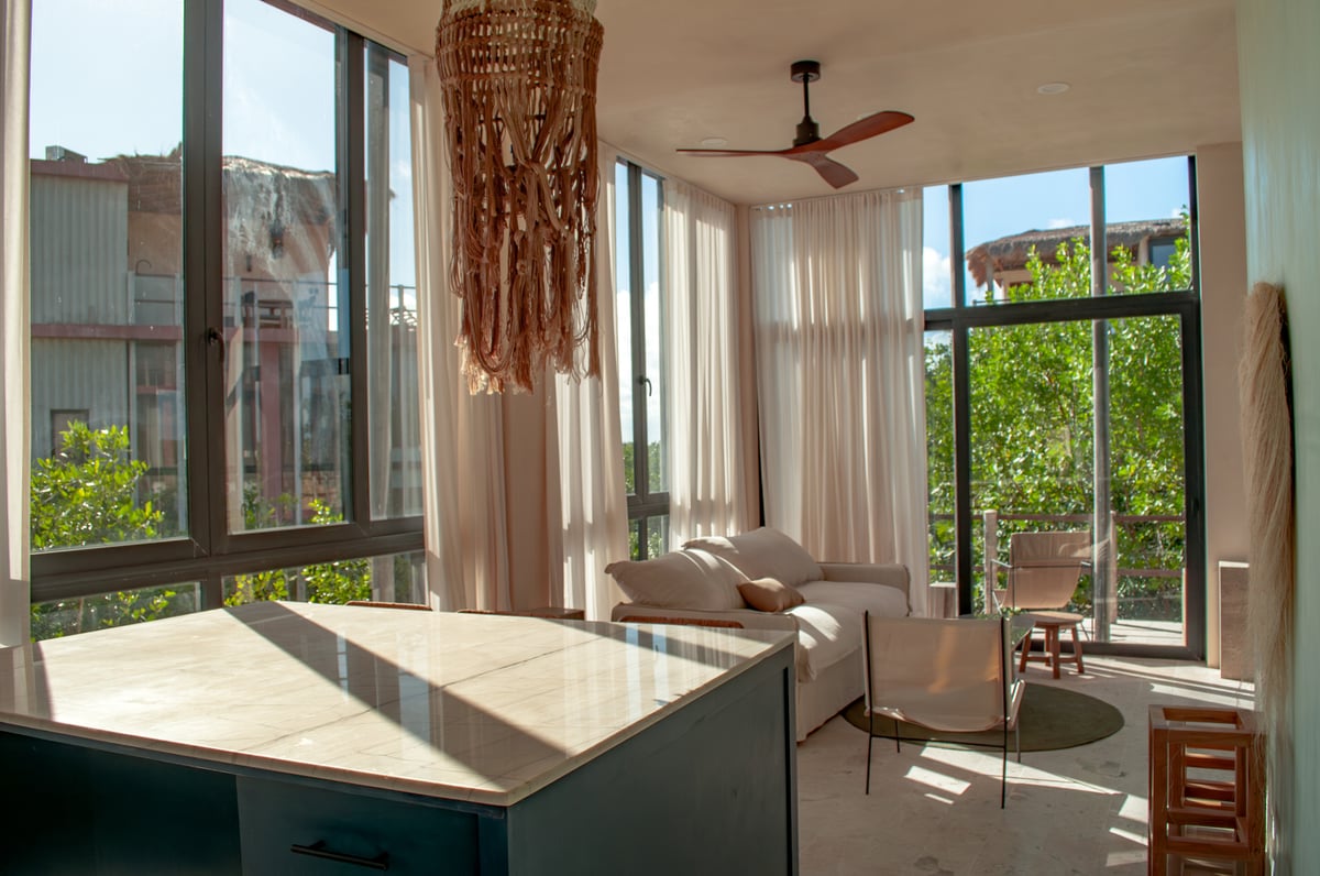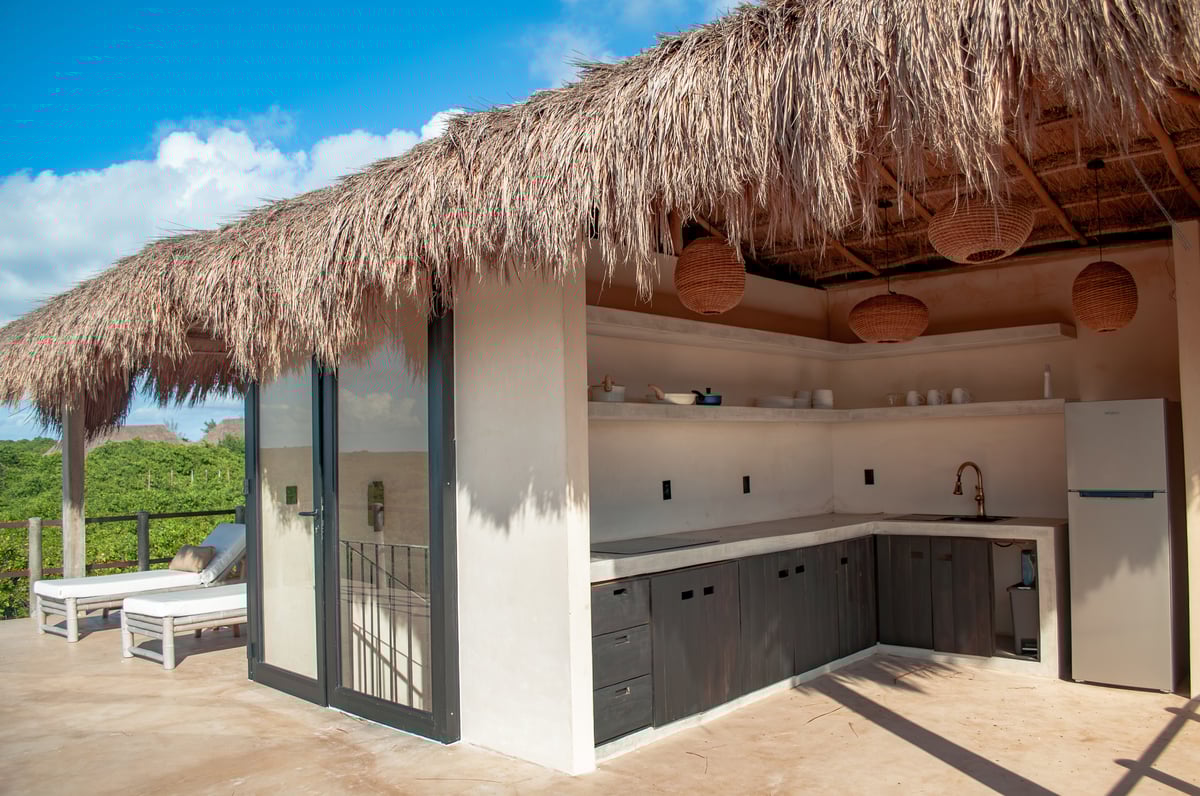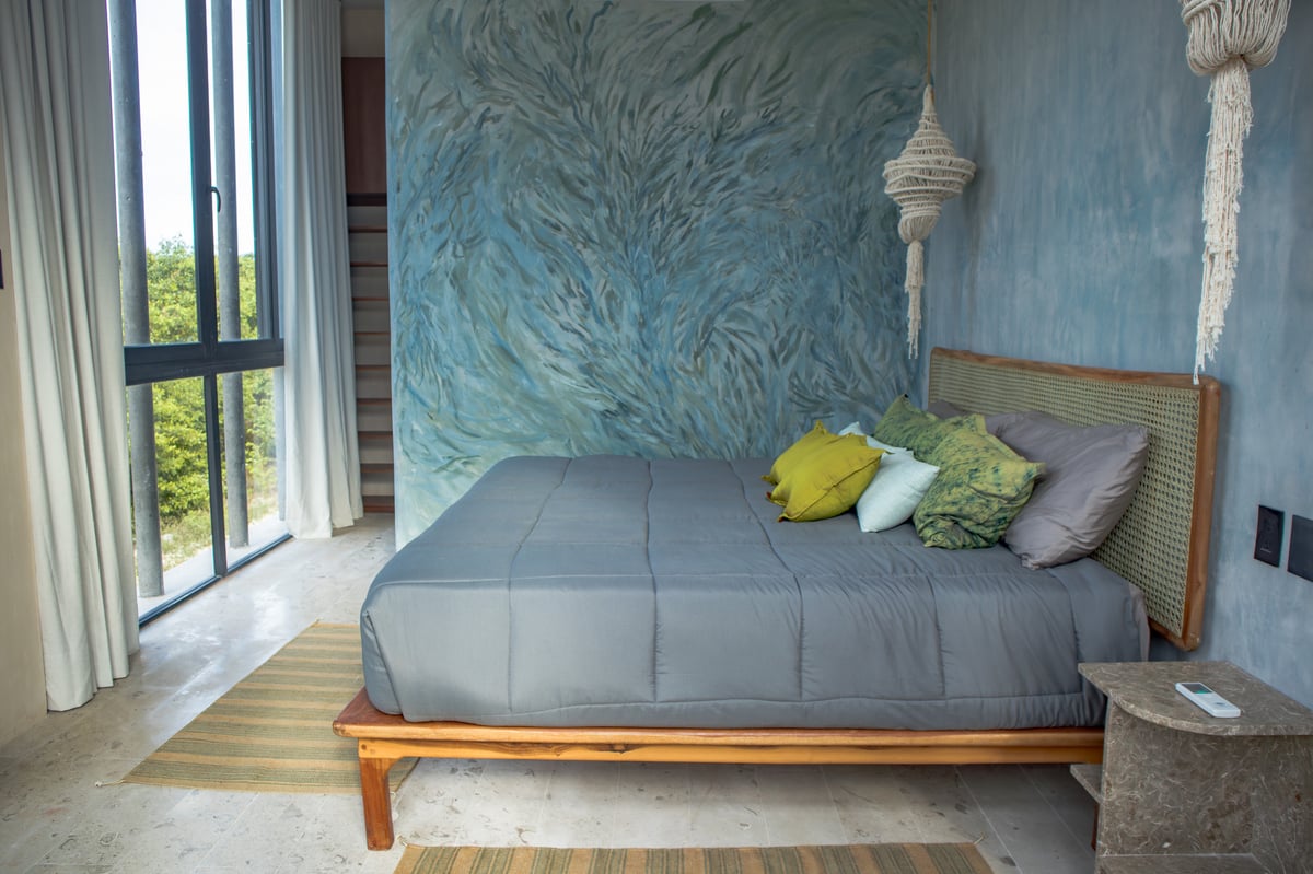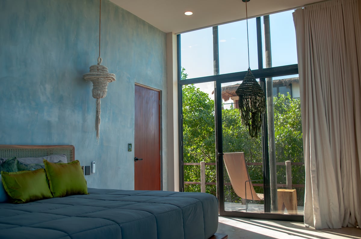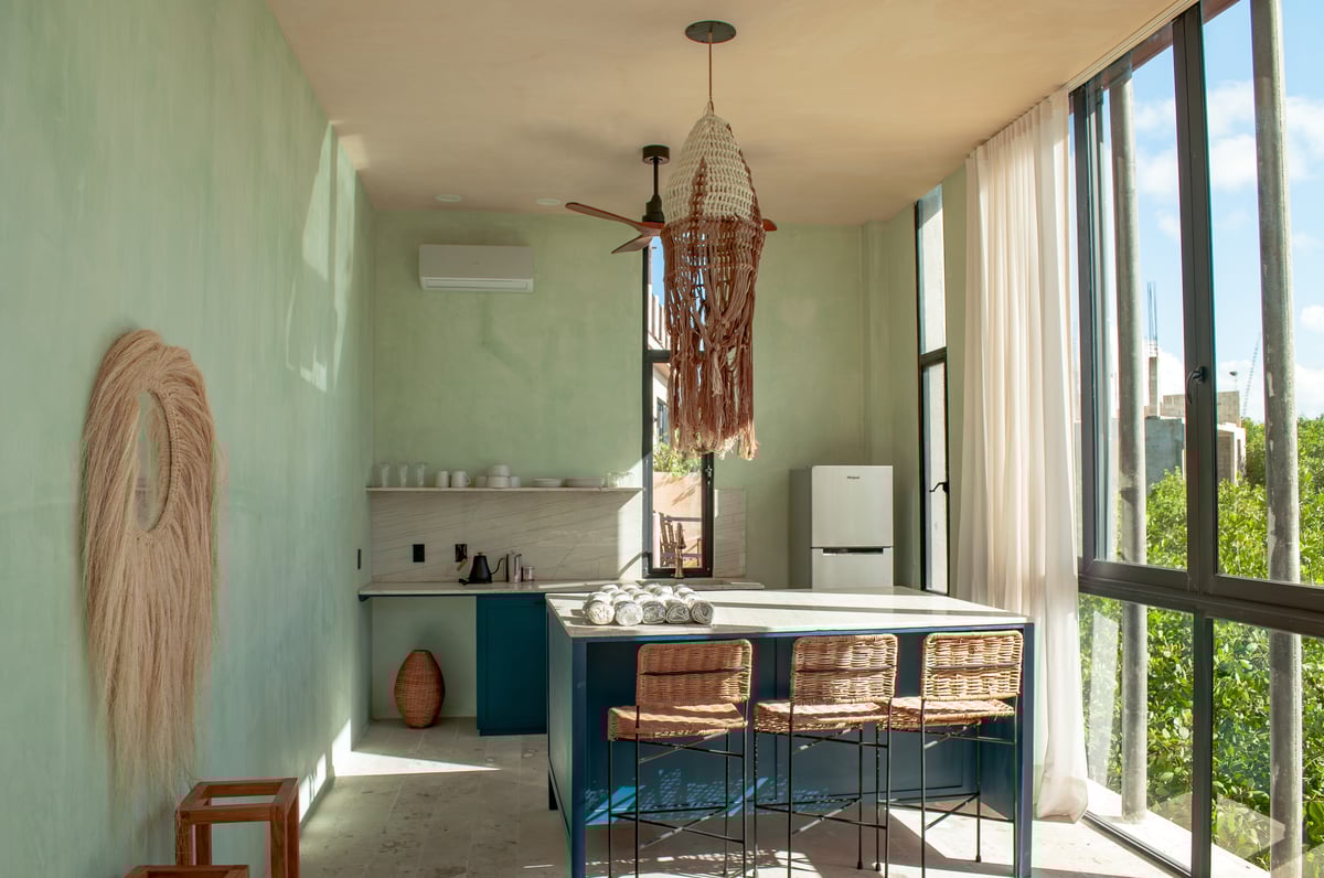 Escape to our Tulum Suite, complete with a private terrace, jungle views, king-size bed, kitchenette, and access to a rooftop with breathtaking sunsets — the perfect retreat for relaxation.